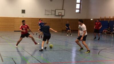 Wir treffen uns jeden Montag von 20:00 – 22:00 Uhr und spielen 2 Stunden Fußball in der Halle (normaler Hallenboden). Gespielt wird mit zwei Mannschaften. Wenn es zu viele sind machen wir drei Mannschaften und spielen im Turniermodus immer zehnminütige Spiele . Der Torwart wird alle 5 Minuten gewechselt, sodass jeder gleich oft ins Tor muss, außer es möchte jemand freiwillig ins Tor.