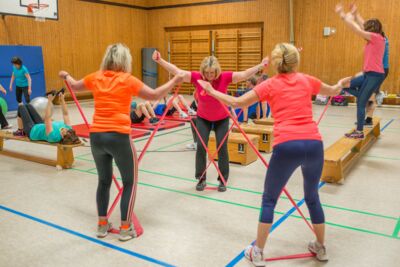 Wir trainieren mit modernen effektiven Fitnessgeräten wie: Brasils, Theraband und Loop, Hanteln, alle Klein- und Großgeräte in der Turnhalle