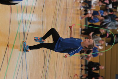 Nach der Mittagspause startete der E3 und E4F Wettkampf. Hier gingen insgesamt 10 Springerinnen für die TGS an den Start. Nach den Speed- und Double Under-Disziplinen, bei denen sich einige bereits über persönliche Bestleistungen freien konnten, folgten die Freestyles. Die Teilnehmer*innen springen eine eigens gewählte Choreografie auf Musik, wobei die Schwierigkeit und die Kreativität der Sprünge bewertet werden.
